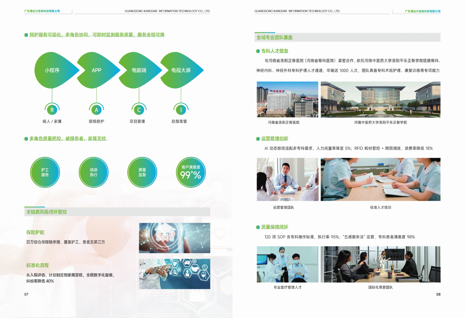 多元化场景适用,实现互联网+陪护 软件+硬件,一体化解决方案 照护服务可视化,多角色协同,可即时检测服务质量,服务全程可溯 多角色质量把控,让服务者、家属无忧 全链路风险闭环控制 全域专业团队覆盖