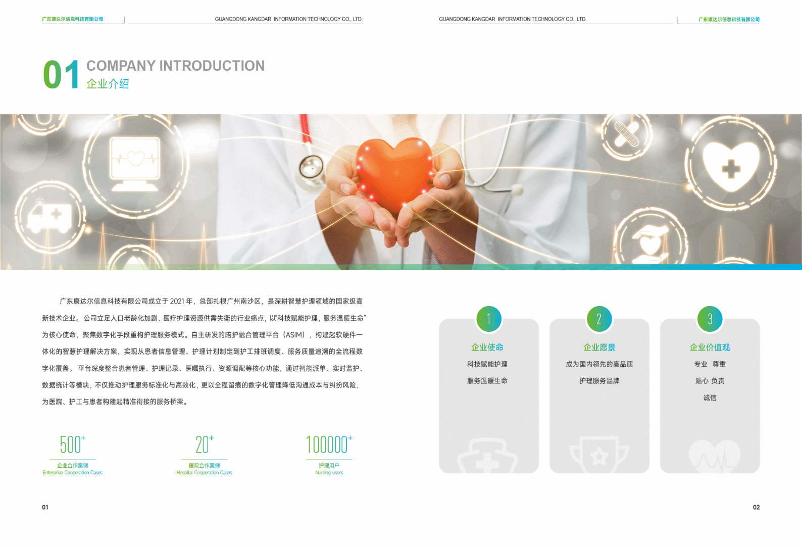 广东康达尔信息科技有限公司成立于2021年,总部扎根广州南沙区,是深耕智慧护理领域的国家级高新技术企业。公司立足人口老龄化加剧,医疗护理资源供需失衡的行业痛点,以“科技赋能护理,服务温暖生命”为核心使命,聚焦数字化手段重构护理服务模式。 自主研发的护理融合管理平台(ASIM),构建起软硬件一体化的智慧护理解决方案,实现从患者信息管理、护理计划制定到护工排版调度、服务质量追溯的全流程数字化覆盖。平台深度整合患者管理、护理记录、医嘱执行、资源调配等核心功能,通过智能派单、实时监护、 数据统计等模块。不仅推动护理服务标准化与高效化,更以全程留痕的数字化管理降低沟通成本与纠纷风险,为医院、护工与患者构建起精准衔接的服务桥梁。